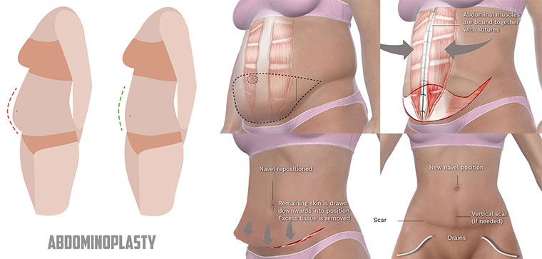 Abdominoplasty or "tummy tuck" is a cosmetic surgery procedure used to make the abdomen thinner and more firm. The surgery involves the removal of excess skin and fat from the middle and lower abdomen in order to tighten the muscle and fascia of the abdominal wall. This type of surgery is usually sought by patients with loose or sagging tissues after pregnancy or major weight loss.
